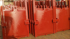 為克服以往鋼門易銹蝕的缺點,閘框、閘板全采用鑄鐵組成,其中閘框又由上橫梁、下橫梁、左直梁、右直梁組成。為了制造、運輸、安裝方便,閘板一般根據其大小或高度情況由上下幾部分拼裝組成。